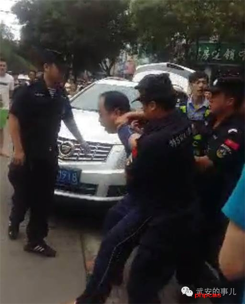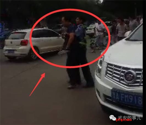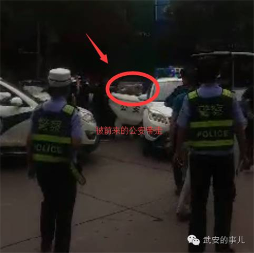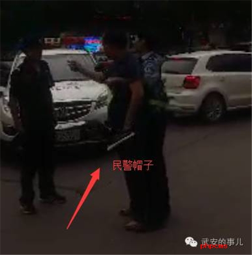 違章人員手里拿著交警的帽子并舉手質(zhì)問(wèn)前來(lái)增援的民警
