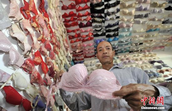 [國(guó)內(nèi)新聞]4月21日,海南省三亞市崖城鎮(zhèn)的陳清祖花費(fèi)20年時(shí)間收集5000余件文胸,在一間棟不起眼小房間的墻壁上、天花板上掛滿(mǎn)了各式各樣的女性文胸,數(shù)量多達(dá)5000余件,而這些令人目不暇接的“藏品”來(lái)自全國(guó)30多所高校的女生。據(jù)陳清祖介紹,他的夢(mèng)想是將來(lái)打造一間文胸收藏館,通過(guò)展示內(nèi)衣,提高全社會(huì)對(duì)女性乳房健康的關(guān)注度。圖為陳清祖展示他的“特別藏品”。