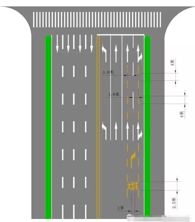 將公交車(chē)等大型車(chē)右轉(zhuǎn)的車(chē)道向道路中心移動(dòng)半個(gè)車(chē)道(此處樹(shù)枝高度已達(dá)到公交車(chē)等大型車(chē)通行要求),右側(cè)第一與第二條存儲(chǔ)車(chē)道中間用黃虛線施劃專供大型車(chē)右轉(zhuǎn)的車(chē)道,并施劃右轉(zhuǎn)箭頭(見(jiàn)示意圖);將右側(cè)第一條右轉(zhuǎn)車(chē)道改為直加右車(chē)道,右側(cè)第二條直加右車(chē)道改為直行車(chē)道,同時(shí)配套修改車(chē)道指示標(biāo)志。